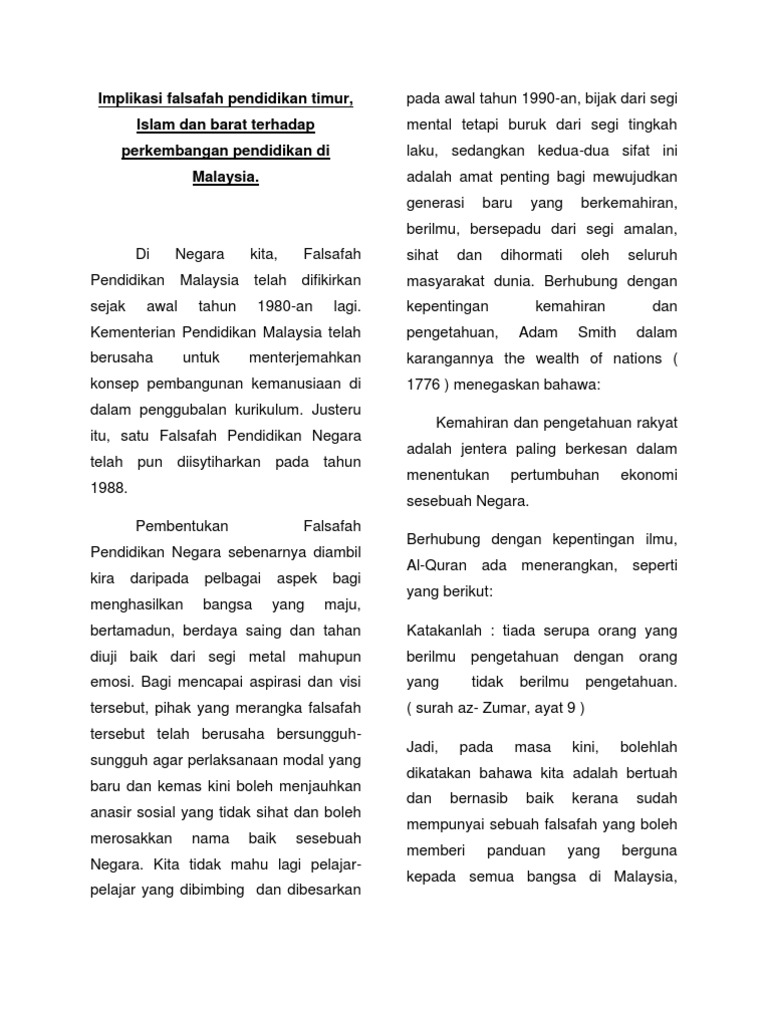 Implikasi Falsafah Pendidikan Timur Islam Dan Barat Terhadap Perkembangan Pendidikan Di Malaysia