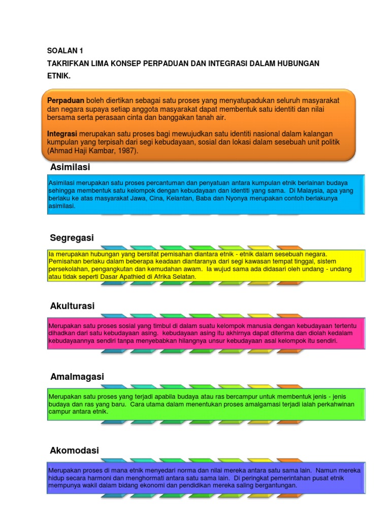 Integrasi dan perpaduan maksud. Memperkenalkan konsep satu malaysia melalui pendidikan antara langkah2 untuk mengatasi masalah yang wujud dalam usaha mewujudkan perpaduan sosial ekonomi kebudayaan sistem persekolahan yang sama bagi semua bahasa. Konsep perpaduan integrasi nasional satu proses penyatuan penduduk berbilang etnik yg mempunyai budaya masing masing di bawah satu bentuk identiti nasional yang khusus tetapi yg dapat diterima oleh hampir semua golongan etnik di negara ini hns2012 2 3. Oleh itu sebuah kementerian telah diwujudkan bagi merealisasikan pencapaian konsep perpaduan dan integrasi. Relatifnya ekonomi dan politik yang stabil akan memberi sumbangan yang besar dalam proses perpaduan.