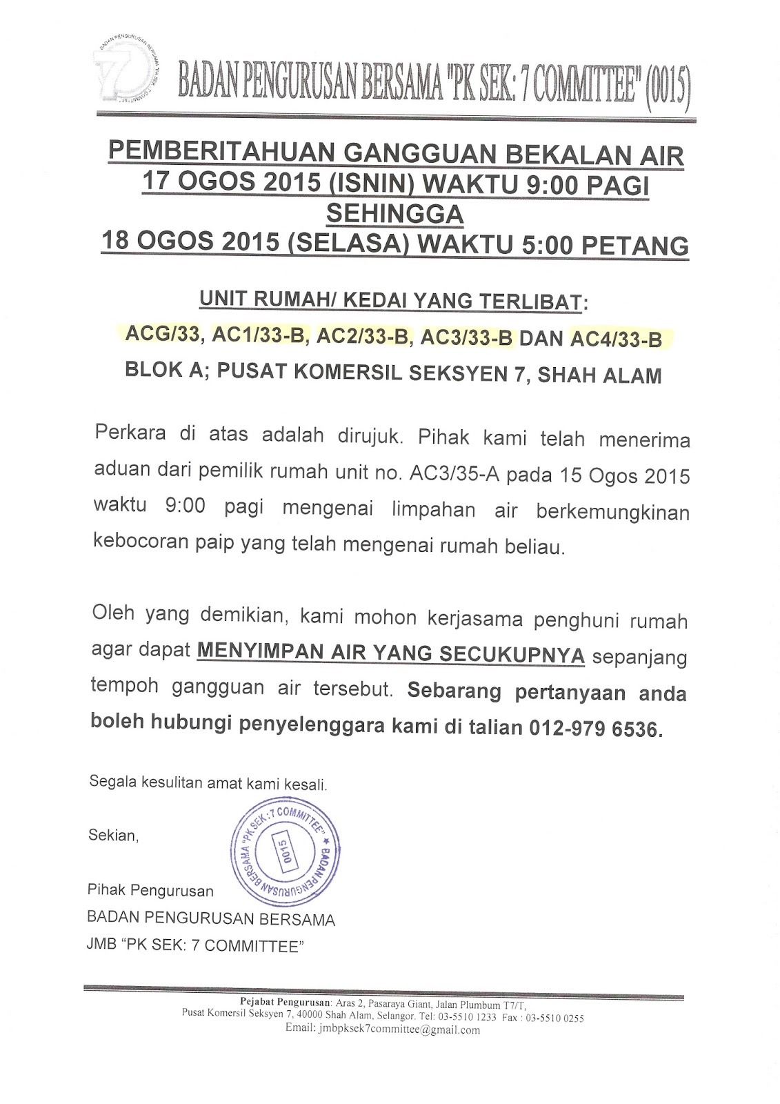 Pemberitahuan Gangguan Bekalan Air 17 Ogos Isnin Waktu 9 00 Pagi Hingga 18 Ogos 2015 Selasa Waktu 5 00 Petang Badan Pengurusan Bersama Jmb Pk Sek 7 Committee
