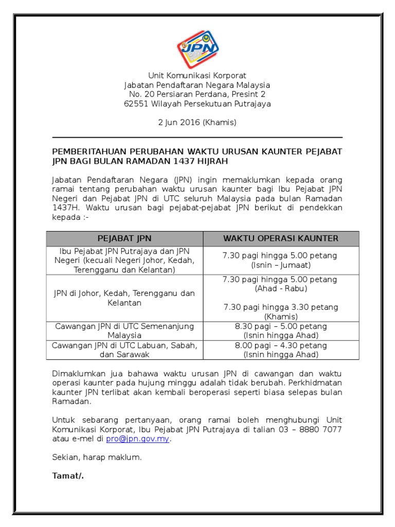 Makluman Hebahan Waktu Operasi Jpn Bulan Ramadhan 1437h