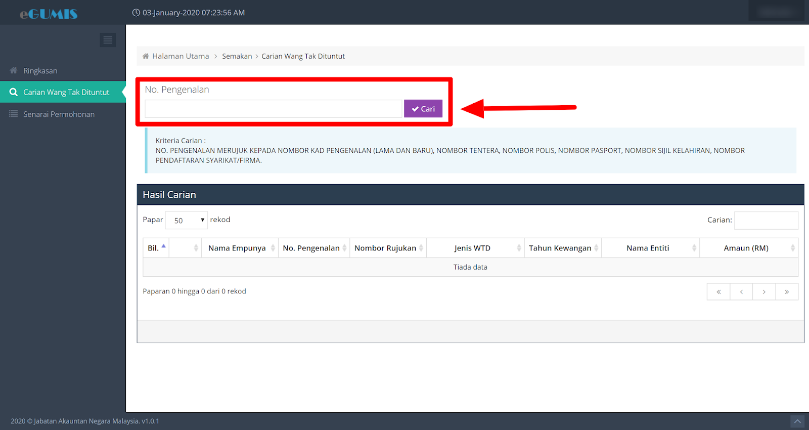 Egumis Permohonan Semakan Wang Tak Dituntut Wtd Online Janm