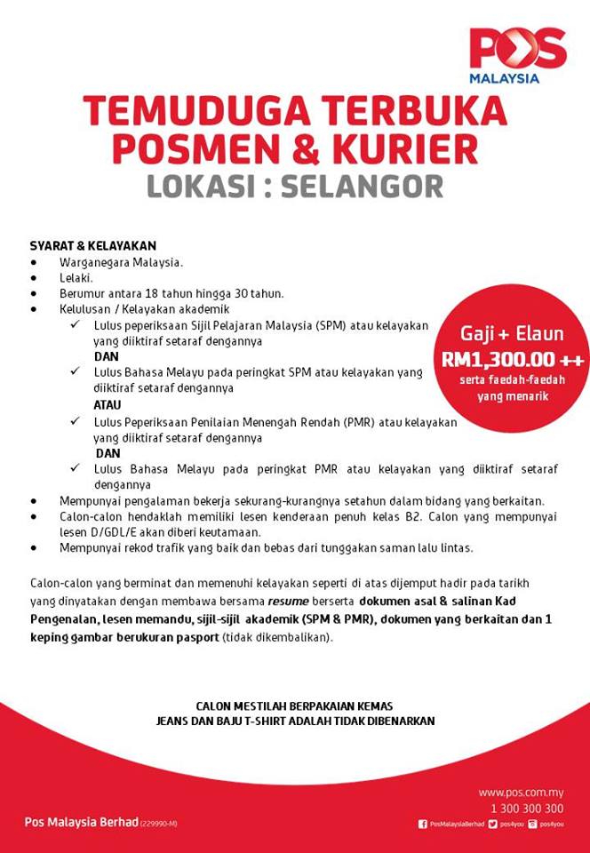 Temuduga Terbuka Jawatan Posmen Dan Pemandu Kurier Di Pos Malaysia Gaji Rm1 300 00 Jobcari Com Jawatan Kosong Terkini
