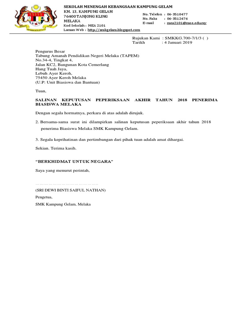 Salinan Keputusan Peperiksaan Akhir Tahun 2018 Penerima Biasiswa Melaka