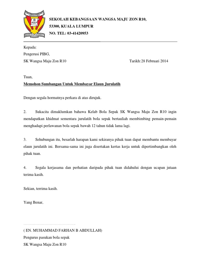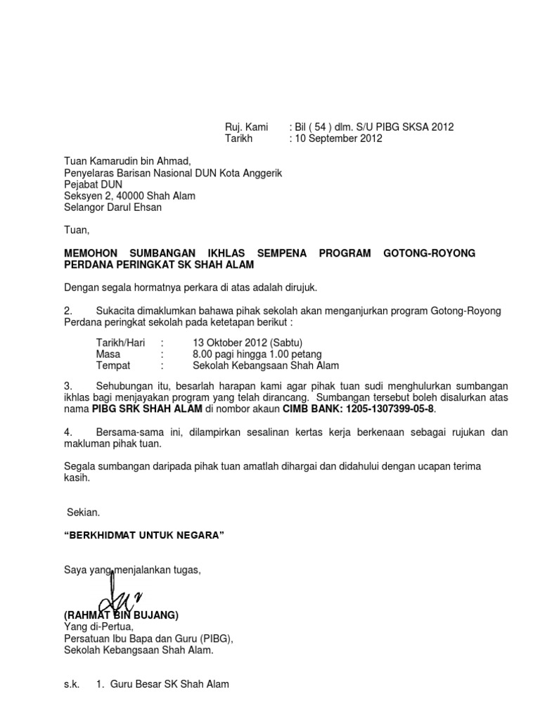 Contoh Surat Rasmi Memohon Sumbangan Pibg Surat Rasmi A