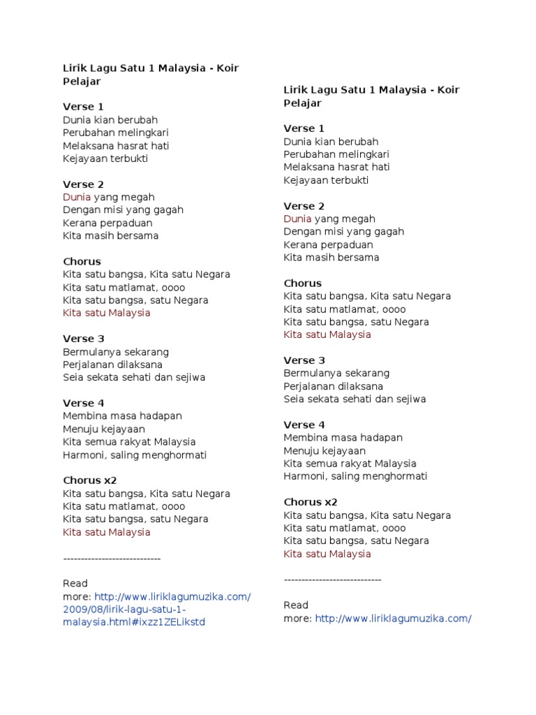 Lirik Lagu Satu 1 Malaysia Koir Pelajar Verse 1 Dunia