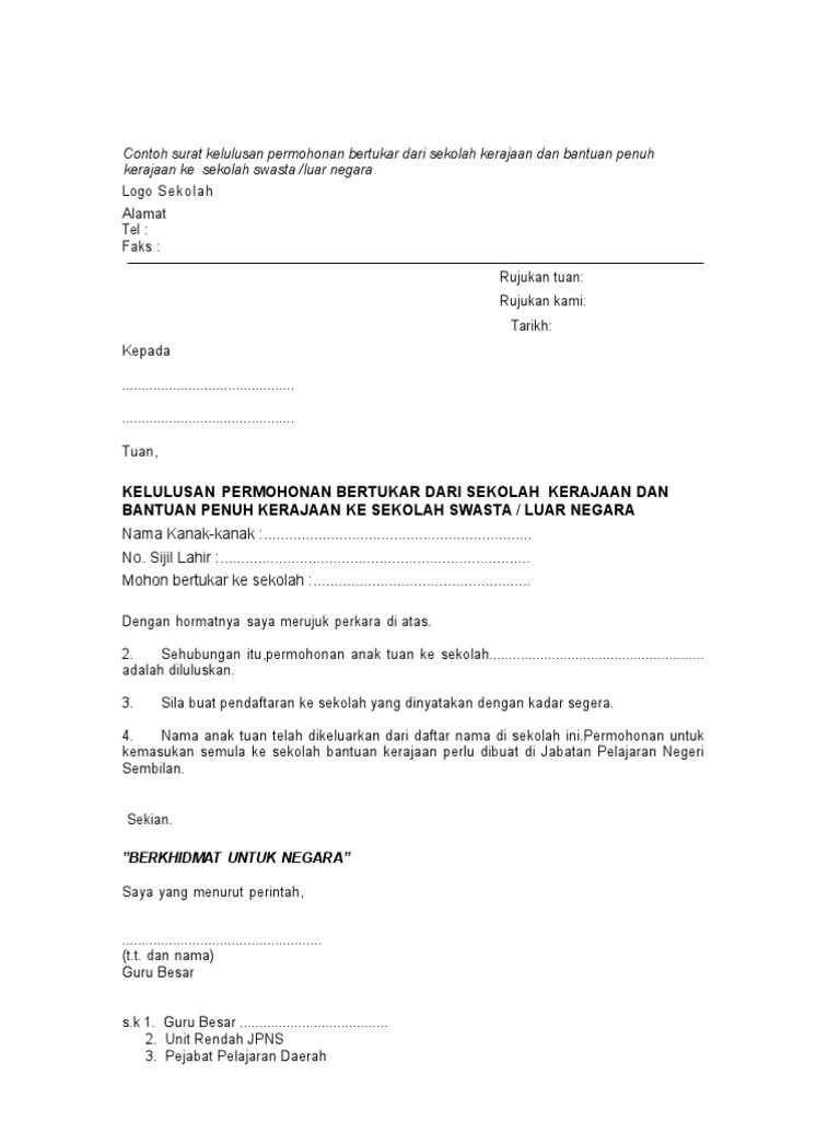 4 Contoh Surat Kelulusan Tukar Sekolah Swasta