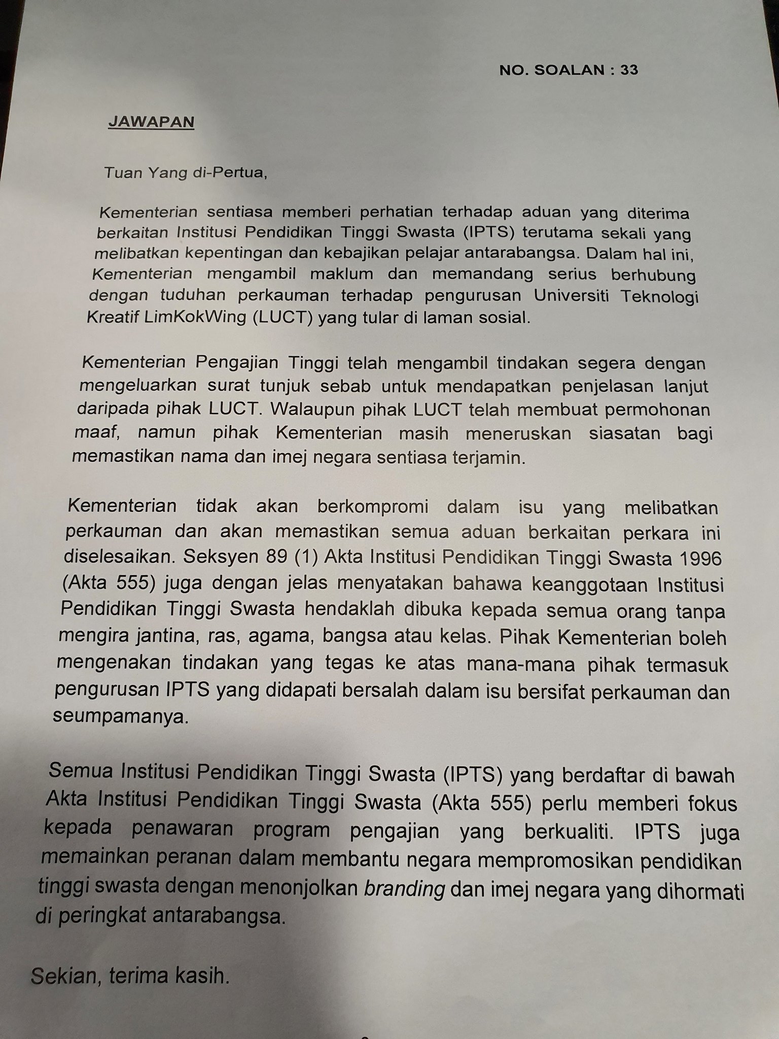 Ong Kian Ming On Twitter My Question On The Accusations Raised Against Limkokwing My Mohe S Reply Show Cause Letter Issued By Mohe Luct Apologized Investigation Still Ongoing Cc Malazdotcom Https T Co Eba4ayaknk