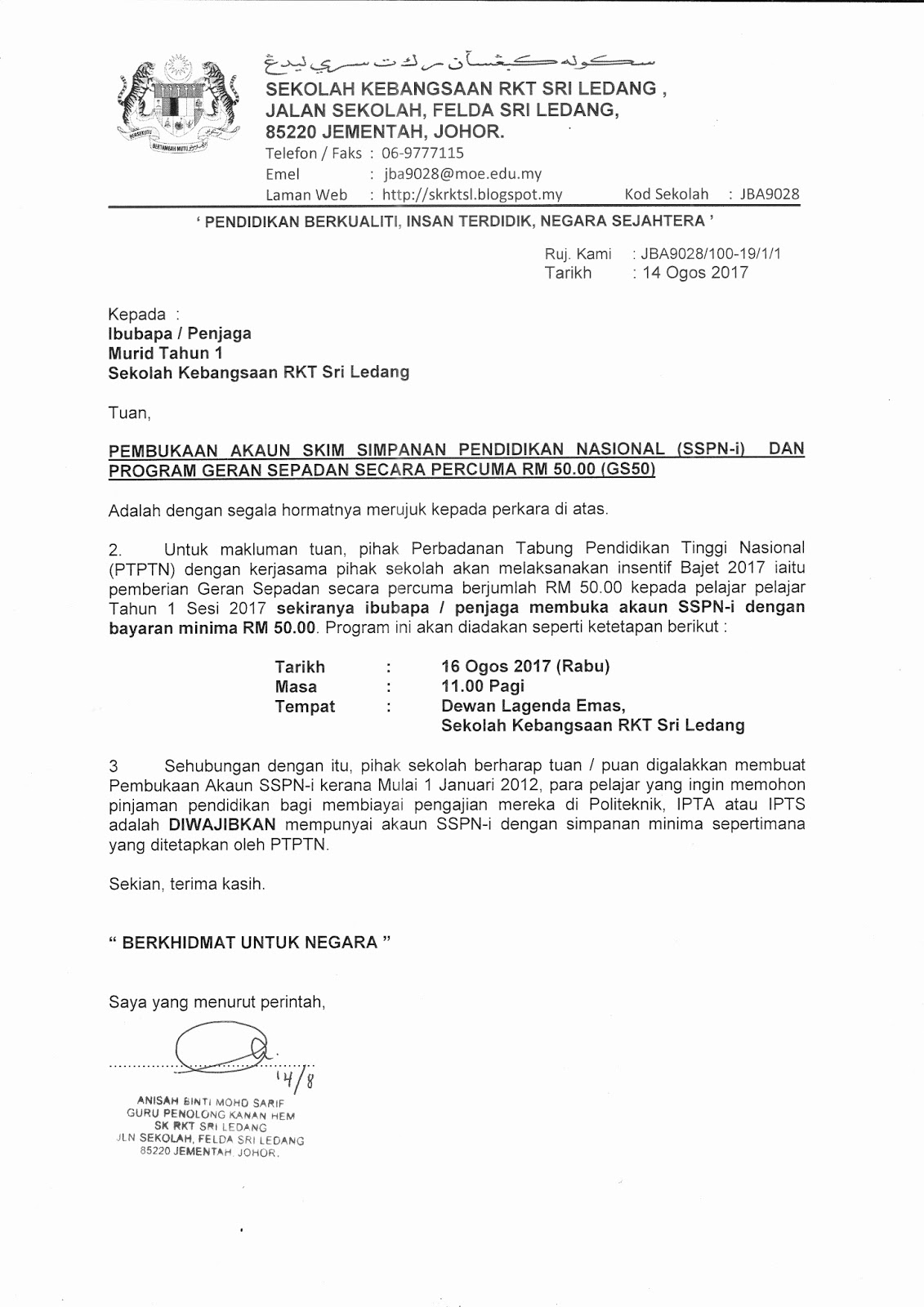 Sekolah Kebangsaan Rkt Sri Ledang Taklimat Pembukaan Akaun Skim Simpanan Pendidikan Nasional Sspn I Dan Program Geran Sepadan Secara Percuma Rm 50 00 Gs50 Untuk Murid Tahun 1 Sesi 2017