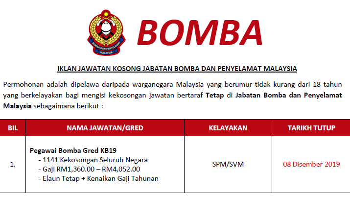 1141 Kekosongan Jawatan Pegawai Bomba Gred Kb19 Ditawarkan Di Jabatan Bomba Dan Penyelamat Malaysia Sehingga 08 Disember 2019 Mingguan Kerja