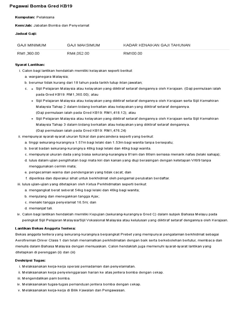 Deskripsi Tugas Gaji Dan Kelayakan Pegawai Bomba Gred Kb19 Sumber Kerjaya